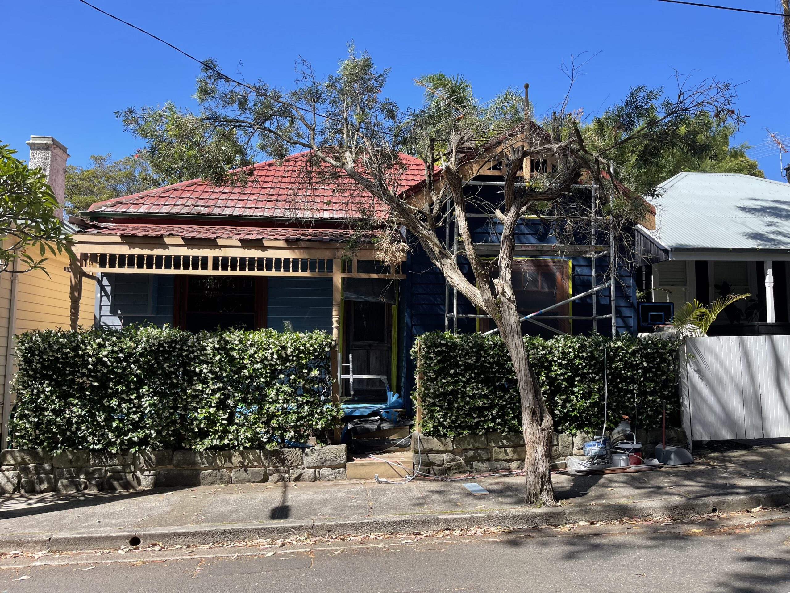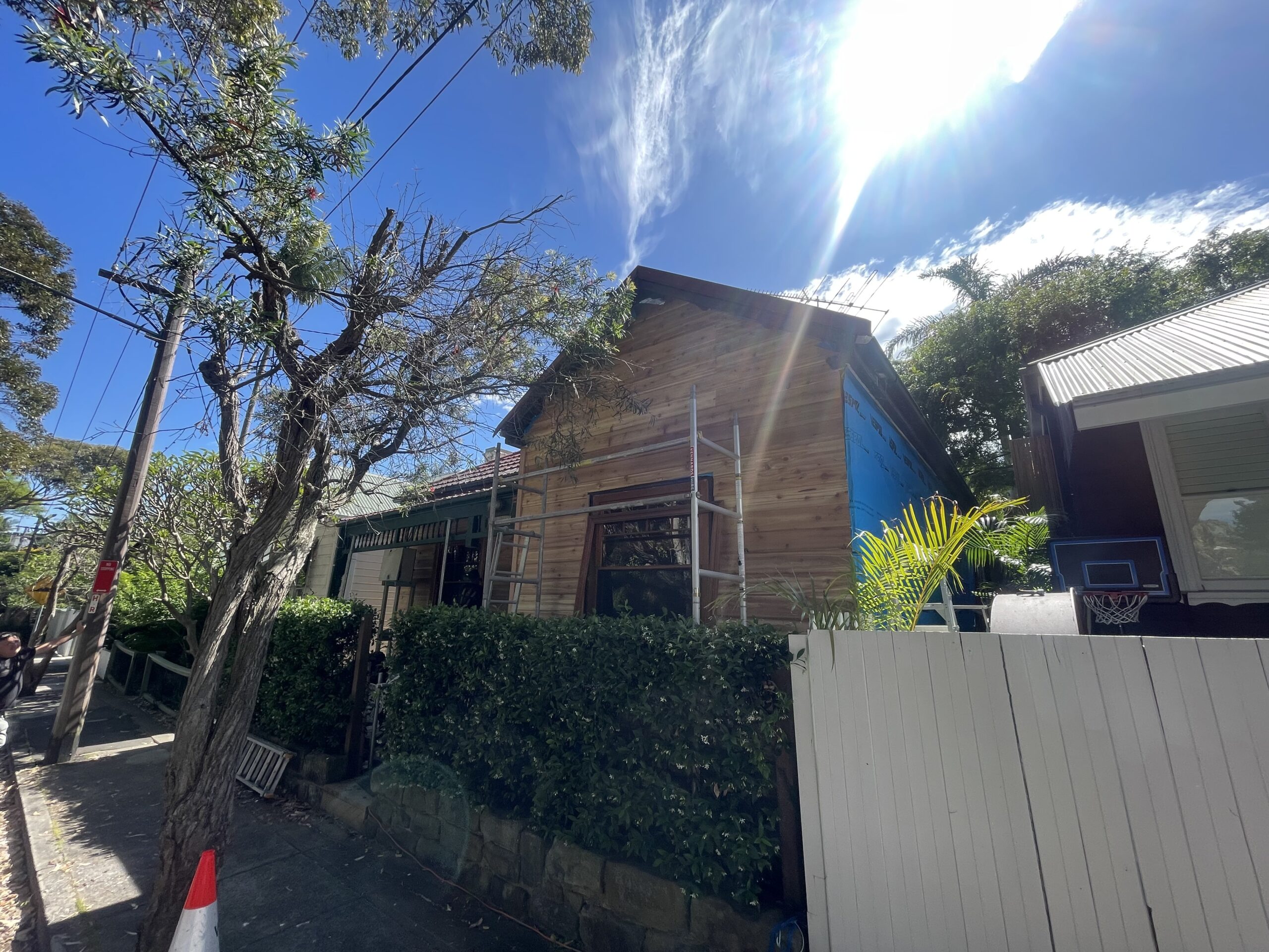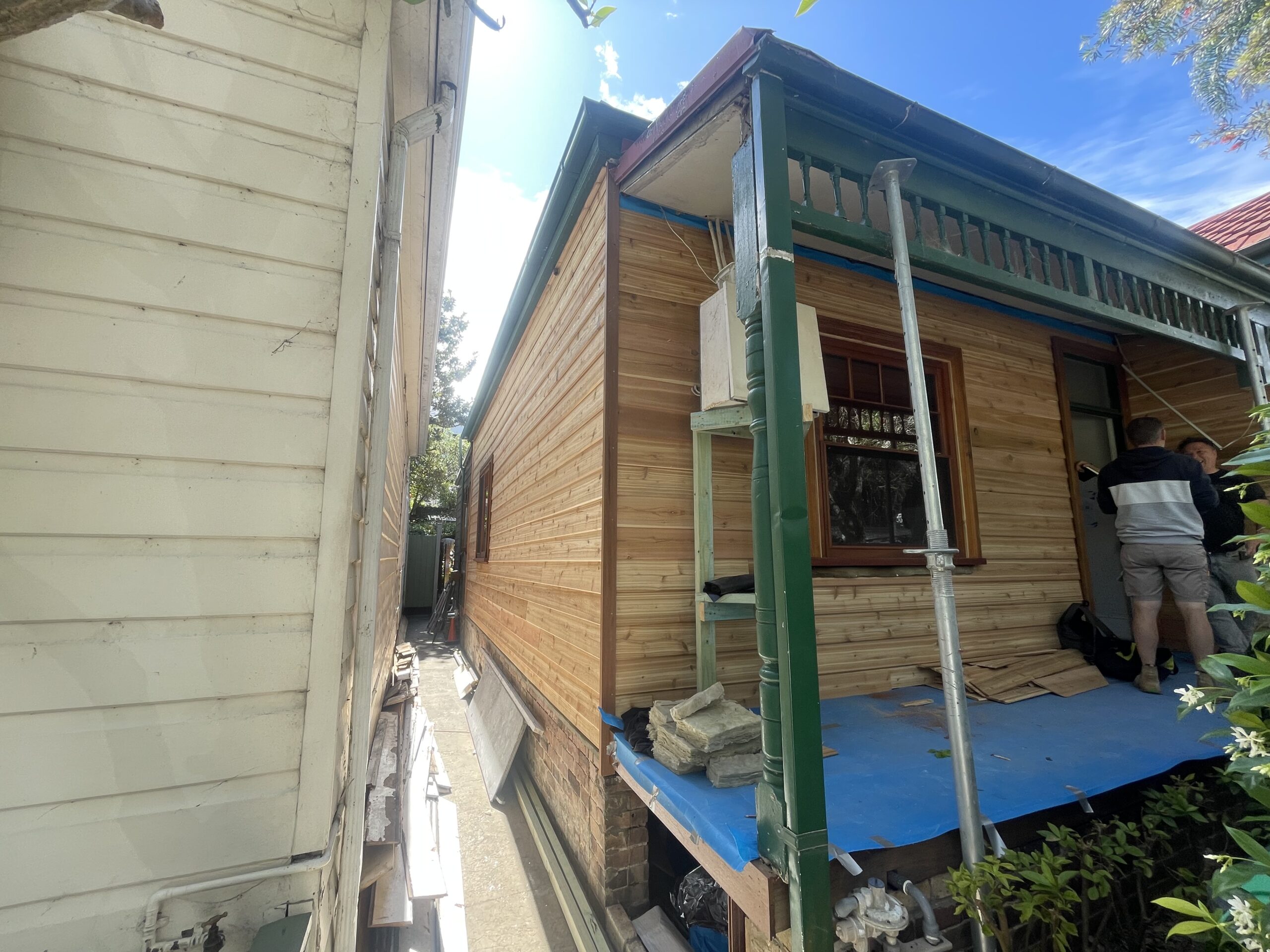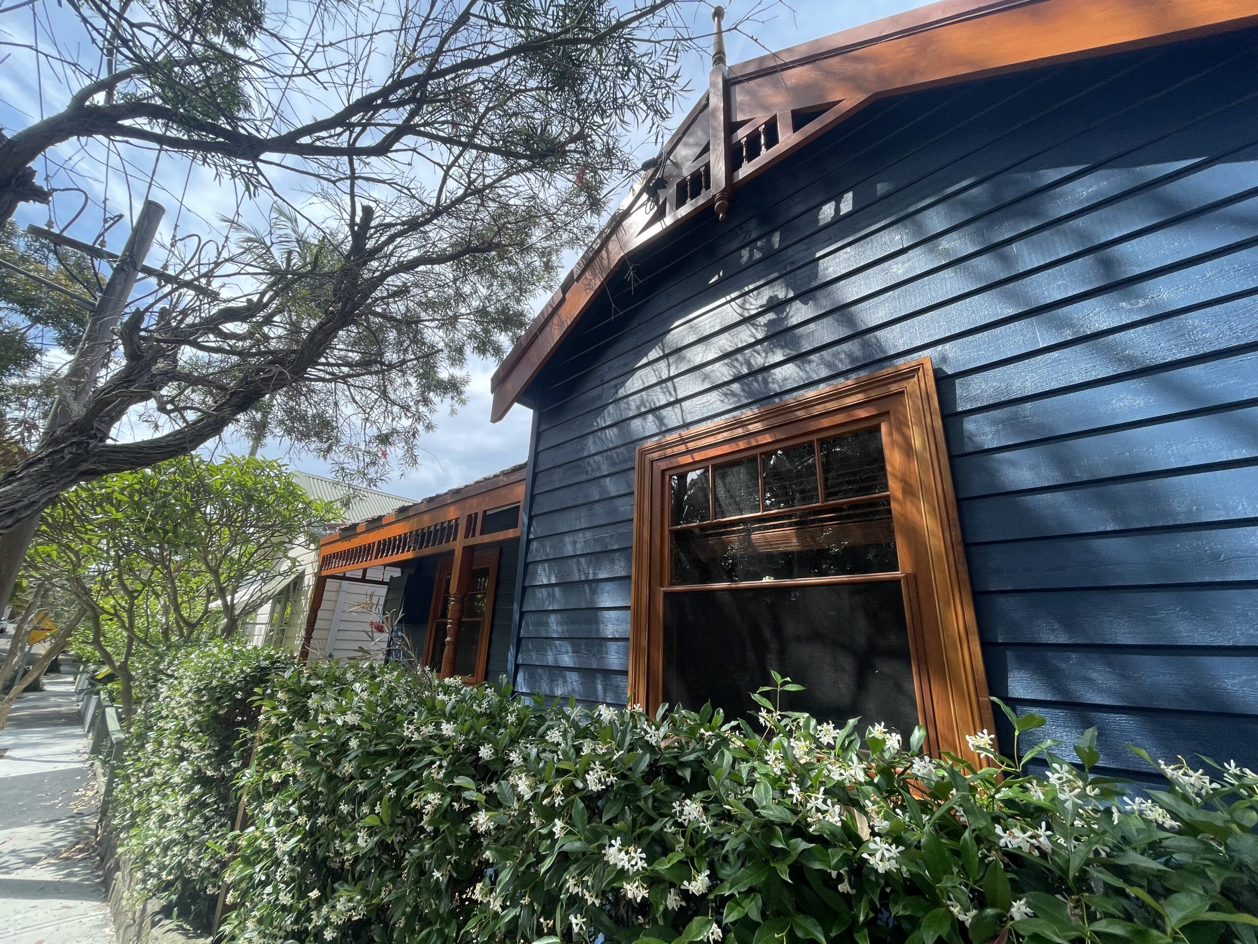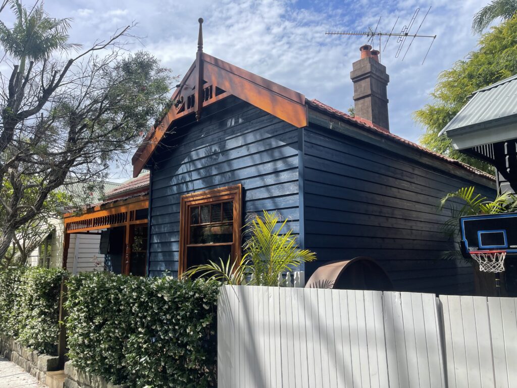 Exterior painting completed for a fisherman’s cottage in Camp Cove featuring newly installed cedar weatherboards. The project involved preparing and finishing the new timber cladding to provide a durable protective coating while maintaining the natural character of this classic coastal home.